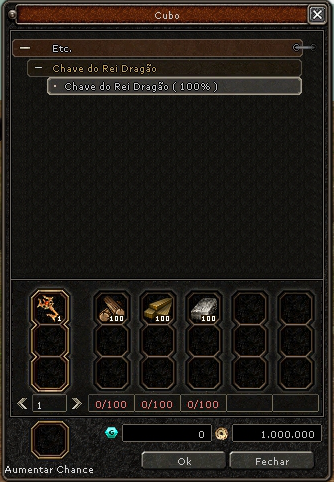 Para criar a Chave do Rei Dragão, clique no NPC Mercador de Medalhas e em seguida em Cubo. Através da janela, basta adicionar os itens necessários e depois clique em ok.