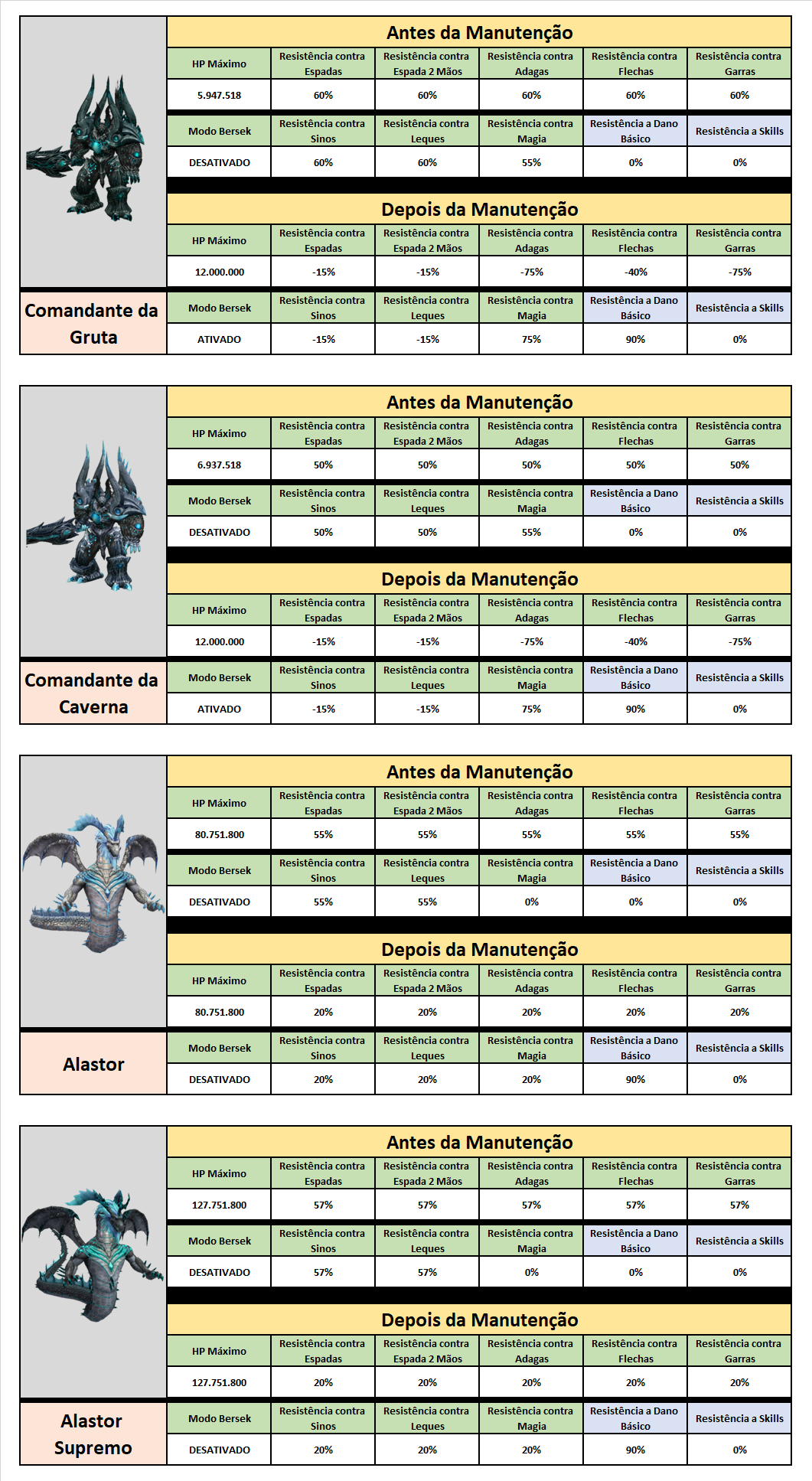 Ajustadas as resistências dos monstros nos mapas abaixo conforme a nova atualização. O refletir também recebeu modificações:
